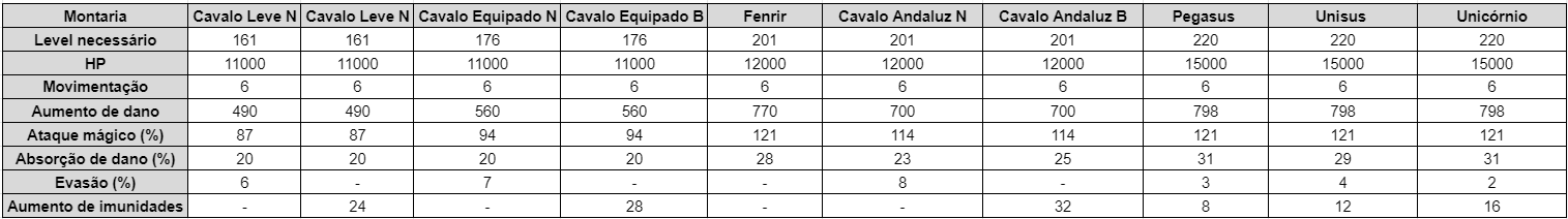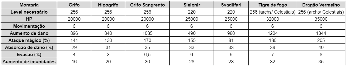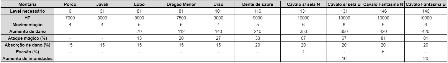 As montarias fazem parte do equipamento de cada personagem. Elas atribuem adicionais que variam de acordo com a classe do animal: velocidade de movimento, dano, ataque mágico, evasão, absorção e imunidades.